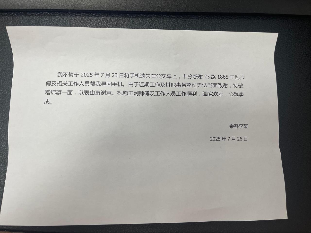 8月26日,青岛城运控股公交集团李沧巴士第七分公司收到一份来自外地的特殊快递——乘客李先生寄来的锦旗与感谢信。这份跨越千里的感谢恒瑞盈,不仅是对公交服务的认可,更让驾驶员王剑拾金不昧的暖心故事被更多人知晓。
